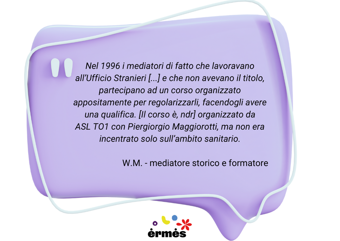 2001Primi corsi di formazione per mediatori/trici organizzati da agenzie formative2003Formazioni specifiche per creare un elenco di chi si occuperà delle traduzioni asseverate in tribunale2004La Provincia di Alessandria affida la gestione del corso per mediatori/trici culturali al consorzio pubblico Istituto per la Cooperazione allo SviluppoCorsi di formazione provinciali e regionali per mediatori/trici con focus sull'ambito giuridico2005In Provincia di Torino si costituisce un Gruppo di lavoro sul tema delle migrazioni (con agenzie formative, enti e persone esperte sul tema)Nasce l'Associazione Multietnica dei Mediatori Interculturali (A.M.M.I.)Inserimento di mediatori/trici tramite selezione con avviso pubblico nei Centri Per l'Impiego della Provincia di TorinoAttivazione di laboratori interculturali progettati da mediatori/trici con il supporto di insegnanti e destinati a tutta la classeSul territorio di Cuneo