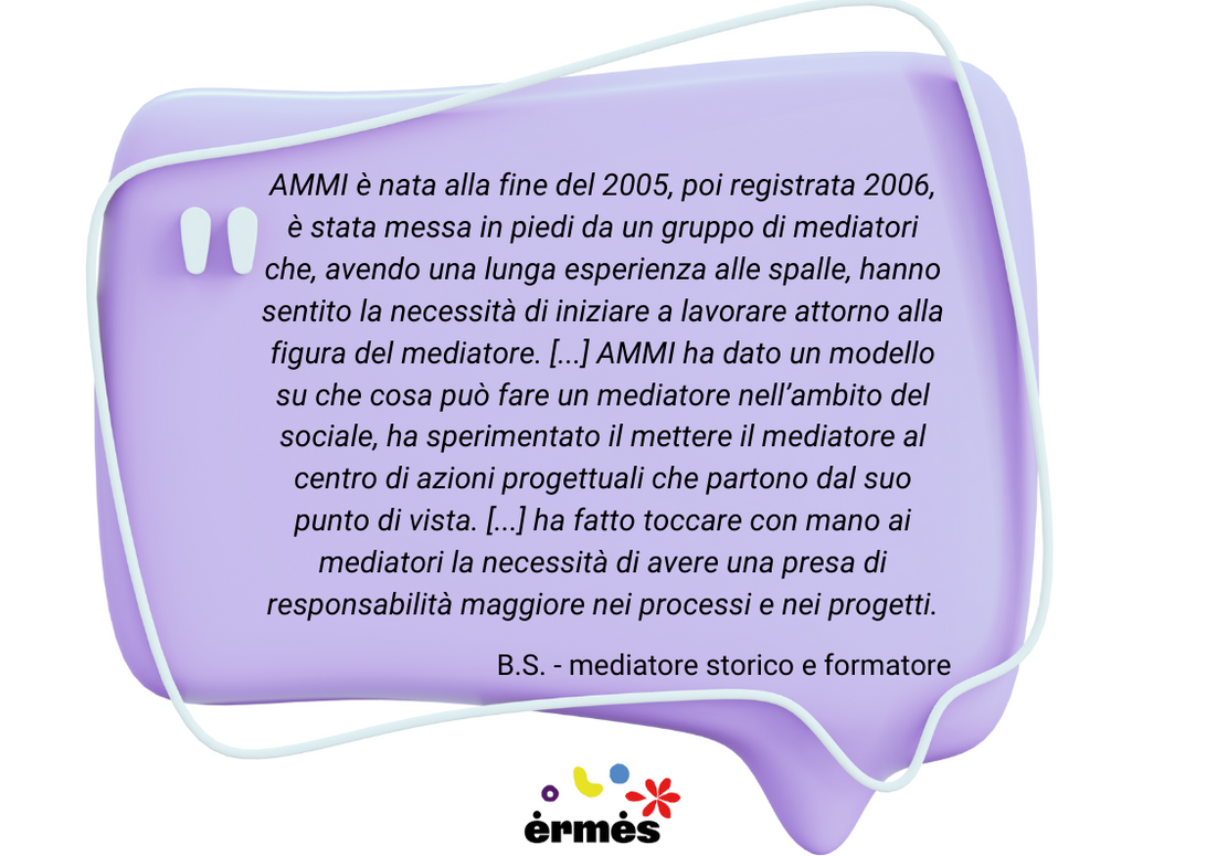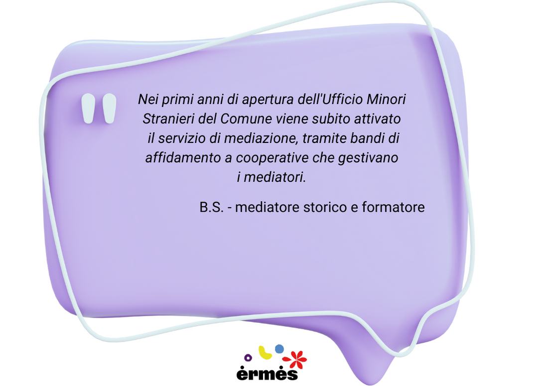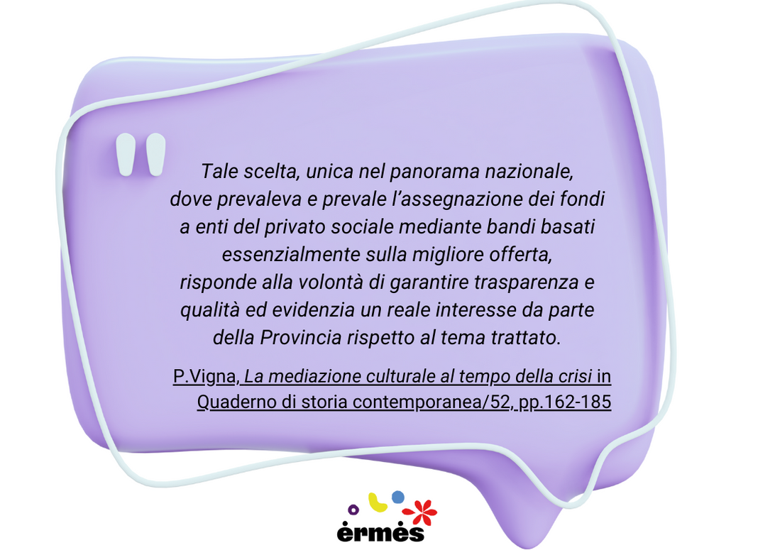 Inserimento di mediatori/trici presso l'Agenzia delle Entrate, gli enti delle funzioni socio-assistenziali, scuole e ad altri servizi del territorioAttraverso il progetto ERMES, che ha realizzato inoltre dei percorsi formativi legati al tema della mediazione interculturale, la Summer School "La mediazione interculturale. Pratiche e orizzonti di cambiamento" e una ricerca sul tema di cui questa linea del tempo ne è un esito.