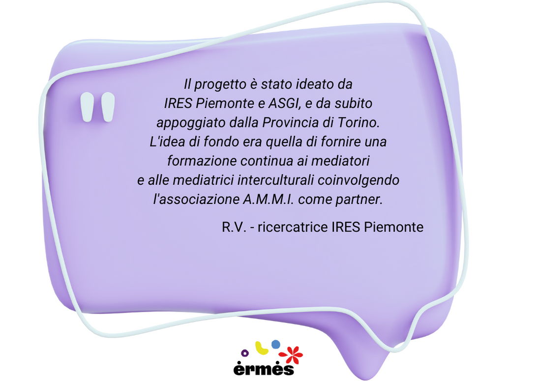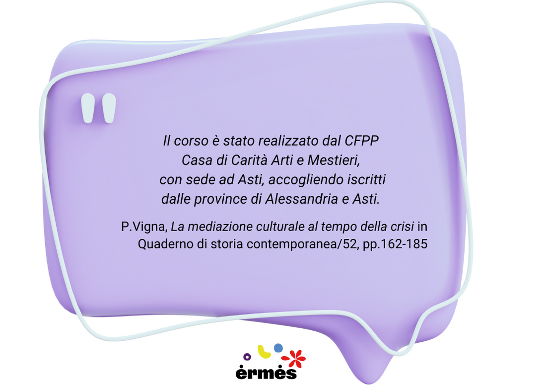 Primo corso per mediatori/trici culturali in Provincia di AlessandriaPrima sperimentazione dell'inserimento lavorativo di mediatori/trici nei Centri Per l'Impiego (CPI) della provincia di TorinoAttraverso il progetto "Sportello mobile di mediazione interculturale"