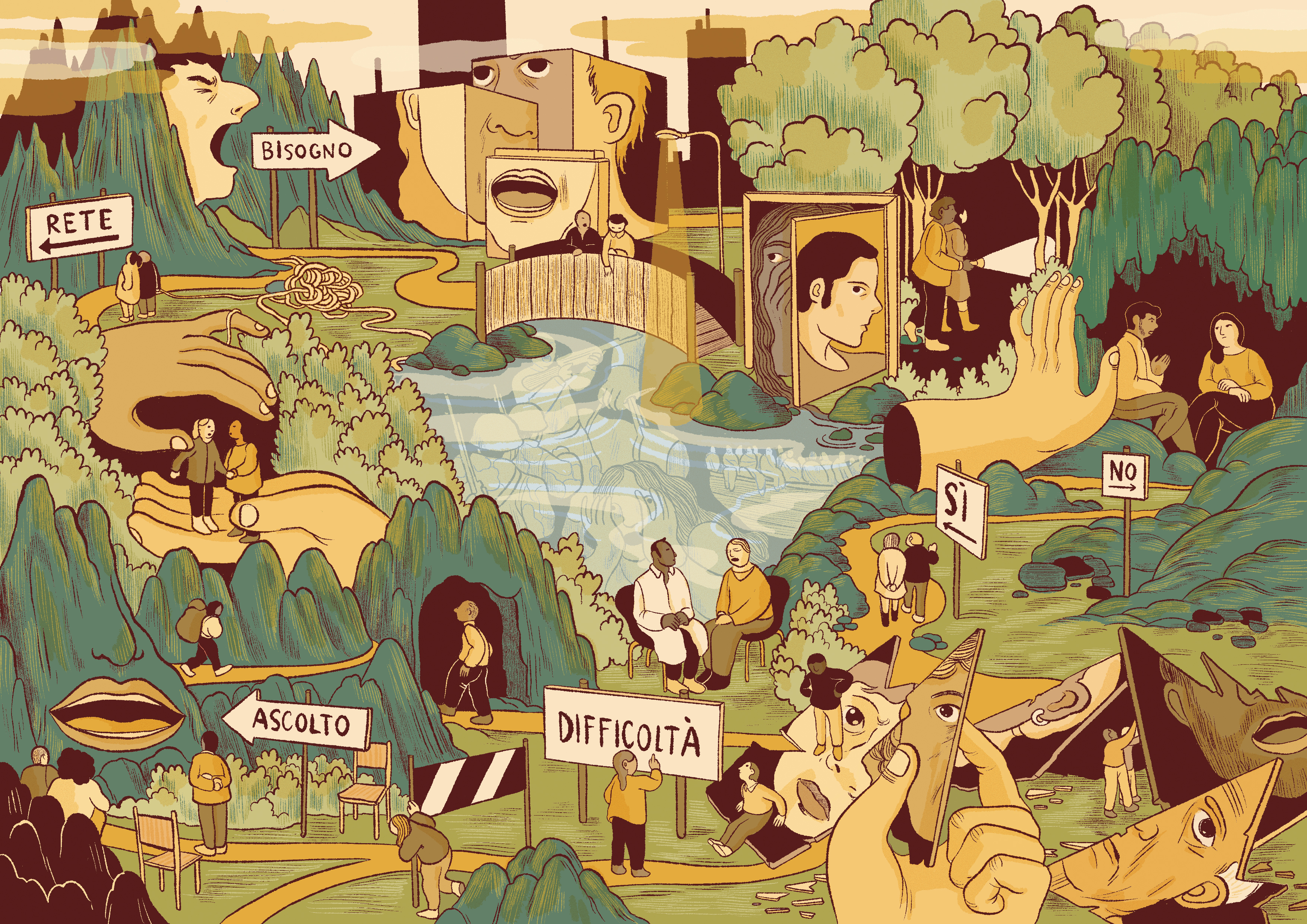 I margini dell’immagine, e del ragionamento, però si sono da subito rivelati permeabili alla complessità che si trova all’interno: un percorso, spesso non lineare, che parte dai bisogni multi-sfaccettati di chi è sopravvissuto a un conflitto e passa attraverso il rapporto con i servizi sul territorio che dovrebbero fornire una risposta a questi bisogni.