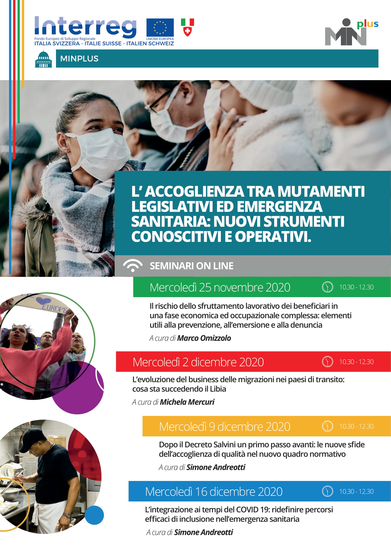 Nell'ambito del progetto Interreg Italia-Svizzera MINPLUS, ciclo di seminari online dedicato ai temi dell’accoglienza e dell’inclusione di richiedenti e beneficiari di protezione internazionale. L'obiettivo degli incontri è quello di proporre un'analisi dei mutamenti che stanno riguardando il quadro normativo nazionale, le condizioni geopolitiche internazionali e la fase complessa sul piano economico e sociale generata dall'emergenza sanitaria.