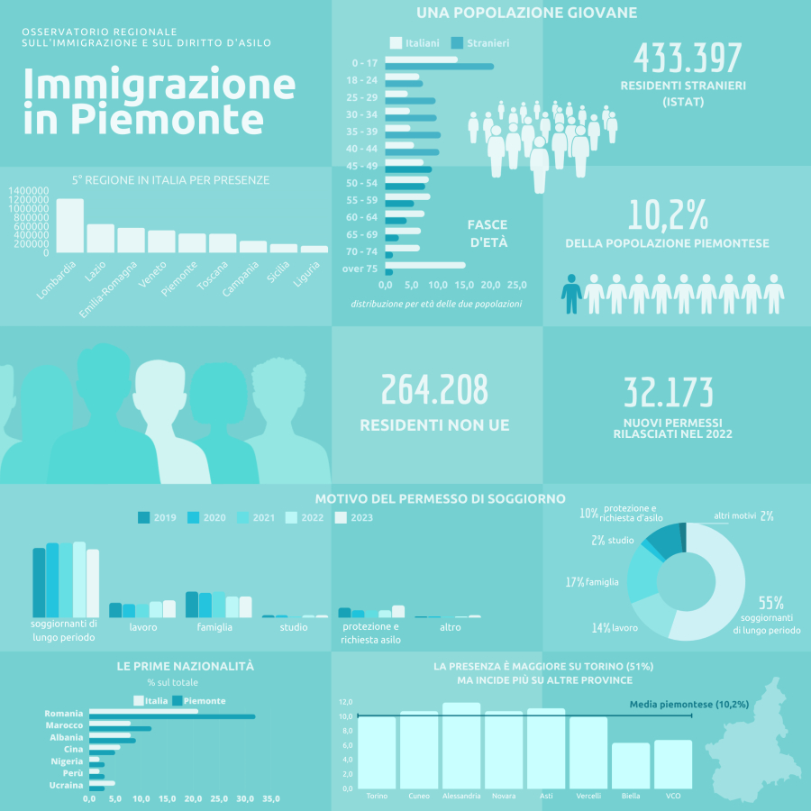 Analisi, tabelle e infografiche interattive aggiornate e scaricabili sui vari temi affrontati dal nostro Osservatorio, come l’immigrazione in Piemonte, nuove generazioni, lavoro, nuovi cittadini e lungo soggiornanti, rifugiati e richiedenti protezione, minori stranieri non accompagnati, sfruttamento lavorativo e vittime di tratta.